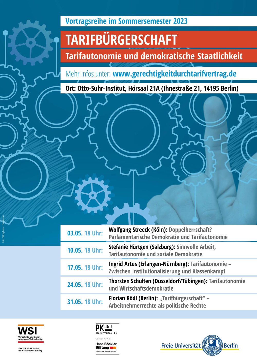 Zusammen mit dem Wirtschafts- und Sozialwissenschaftlichen Institut (WSI) der Hans-Böckler-Stiftung laden wir Sie als Promotionskolleg „Gerechtigkeit durch Tarifvertrag“ an der Freien Universität Berlin herzlich ein, mit uns zu diskutieren. Die Vortragsreihe findet im Mai immer mittwochs um 18 Uhr im Hörsaal 21A im Otto-Suhr-Institut (Ihnenstraße 21, 14195 Berlin) der Freien Universität Berlin statt.