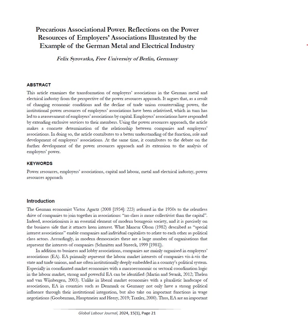 Syrovatka, Felix (2024): Precarious Associational Power. Reflections on the Power Resources of Employers Associations Illustrated by the Example of the German Metal and Electrical Industry. In: Global Labour Journal 15 (1): 21-39.