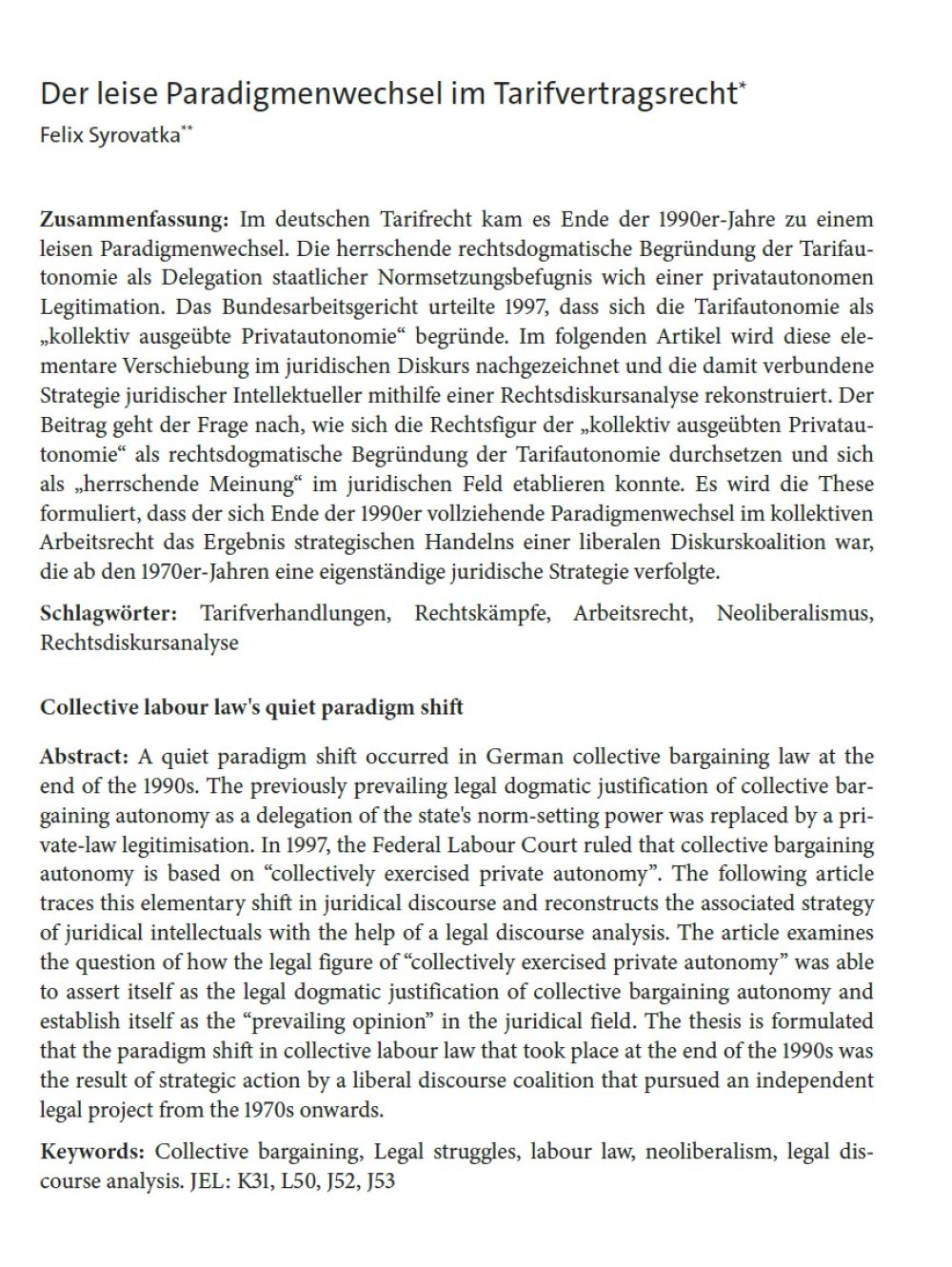Syrovatka, Felix (2023): „Der leise Paradigmenwechsel im Tarifvertragsrecht“. In: Industrielle Beziehungen. Zeitschrift für Arbeit, Organisation und Management.30(3): 5-33. DOI: https://doi.org/10.5771/0943-2779-2023-3-5
